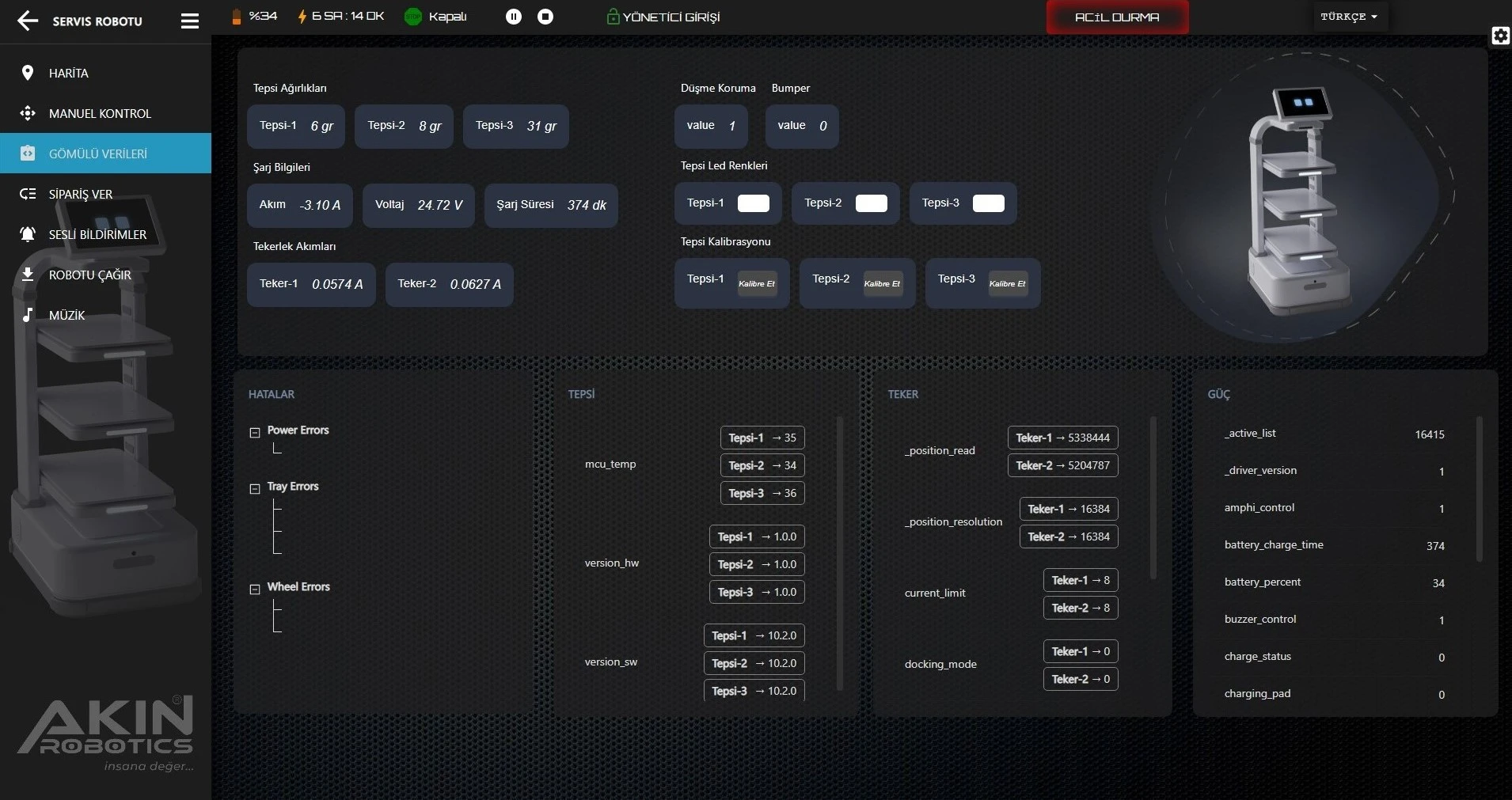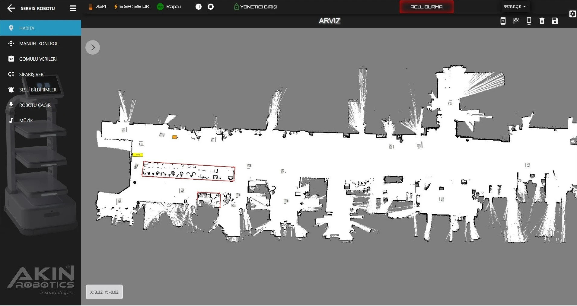 The application also supports manual control of the robot. This means that the robot can easily be directed to desired locations to take orders and make deliveries. Additionally, the robot’s hardware data can be monitored in real-time, ensuring both its performance and health status are continuously under control.