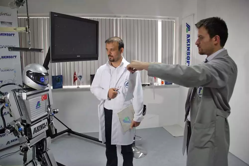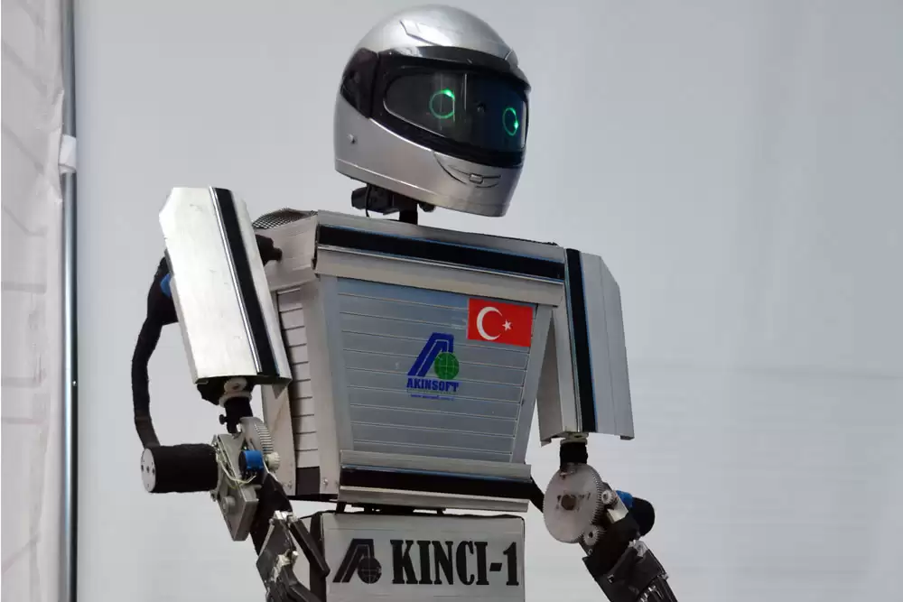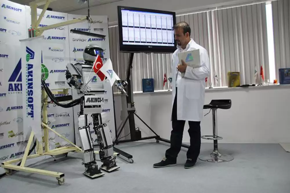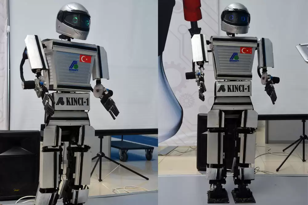 The AKINCI, produced with high technology by AKINROBOTICS, is the first humanoid robot prototype in Turkey. It is a project that began its R&D studies in 2009. AKINCI-1, the second prototype of the project, can demonstrate humanoid features such as moving fingers, arm joints, and other joint movements. It also has the ability to walk through its legs and can speak Turkish. However, it performs detection and speaking features in a limited manner. It has a total weight 45 kilograms and a height of 145 cm. Equipped with a balance sensor, AKINCI-1 can respond instantly to external forces (pushing, obstacles on the road, ramps, etc.) during walking to maintain balance. It has abilities such as vision with a 2D camera, determining direction while walking to reach the target point, and determining ground orientation using sensors.