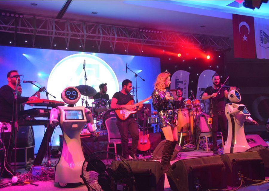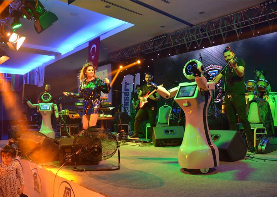 AKINROBOTICS robots — ADA GH6s, ADA GH5s, Mini ADAs, AKINCI 4, and ARAT — participated in the AKINSOFT 14th Bonus Period Award Ceremony and Holiday Event held at the Miracle Hotel in Antalya between November 22–25, 2018. The robots took on various duties such as guest reception and product promotion, and during Merve Özbey’s concert, they danced, giving guests unforgettable moments.