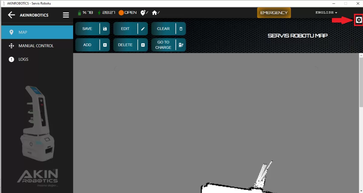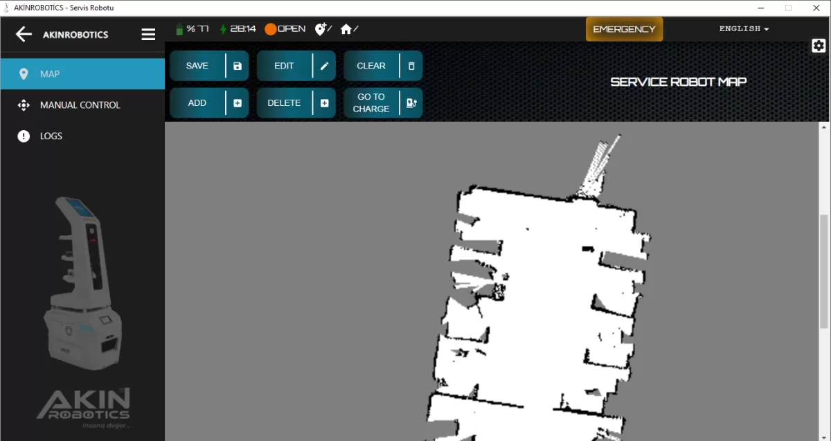 After clicking the create map button, enter the manual control page and walk your robot around the area to be mapped. After this process, save the map by pressing the save button.