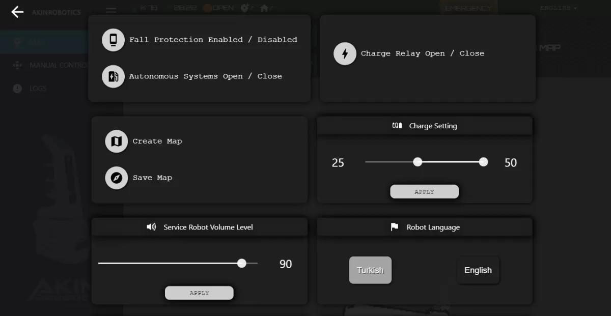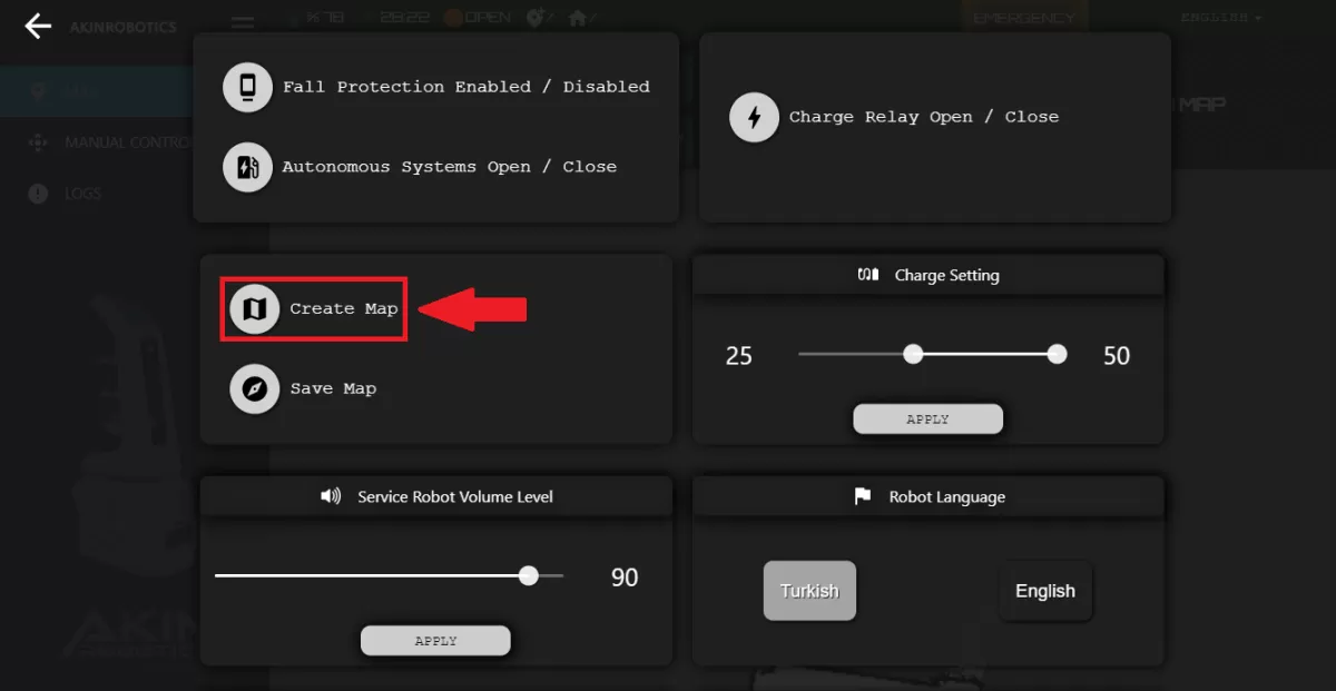 Information: Autonomous systems will turn off automatically when switching to the manual control page. After the mapping process is completed, bring your robot one meter in front of the autonomous charging unit and turn on the autonomous systems from the settings menu.
