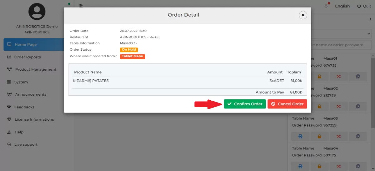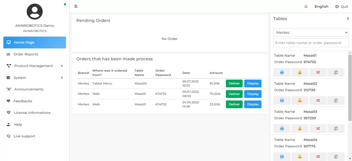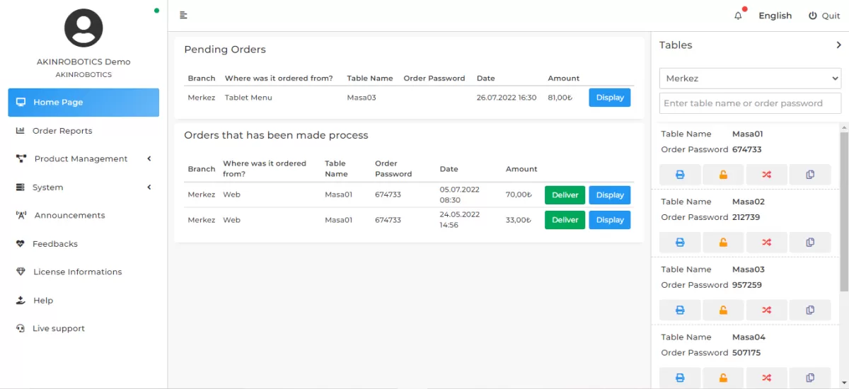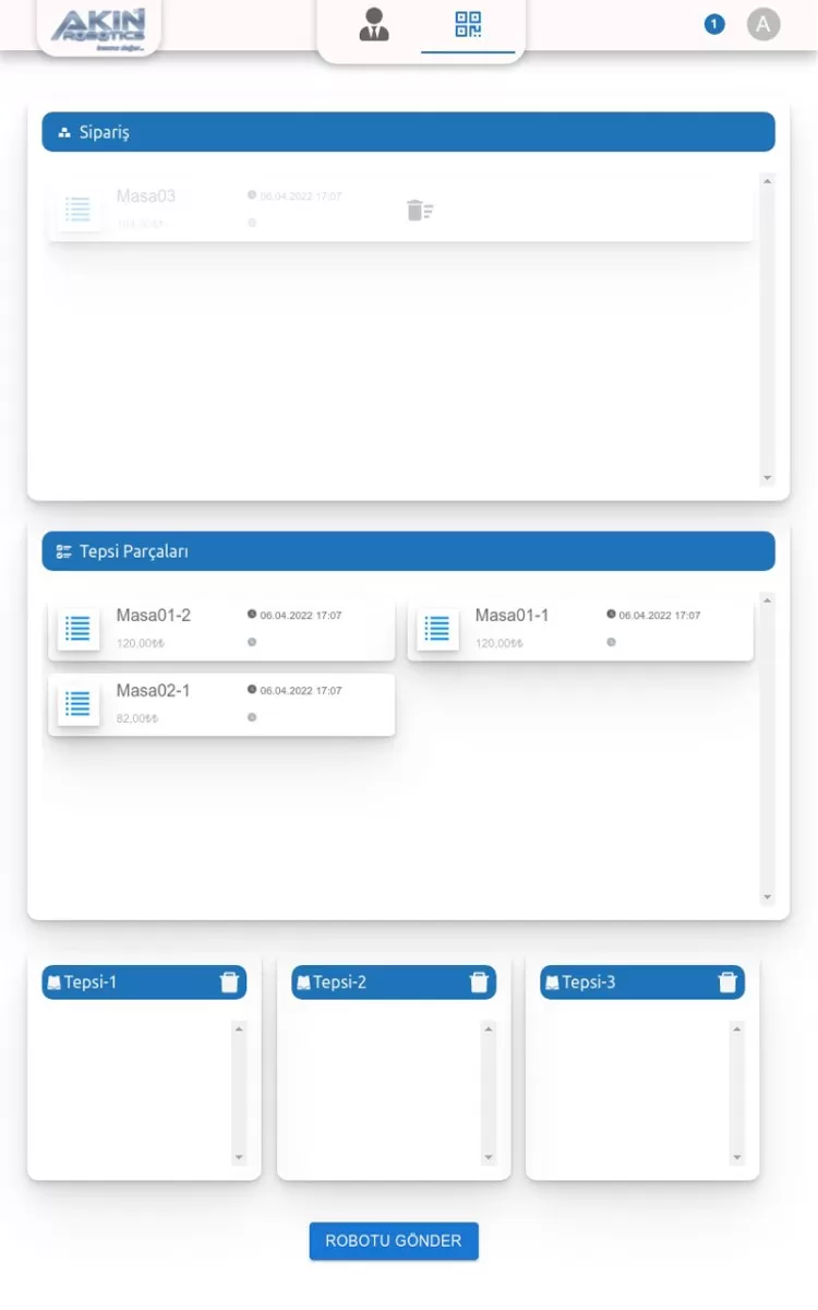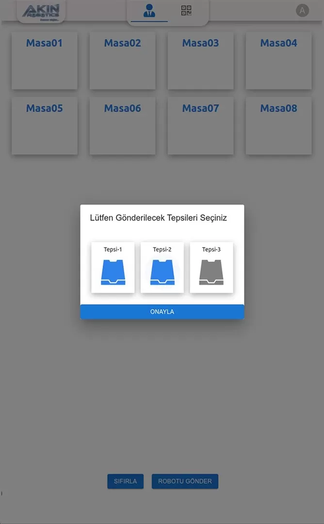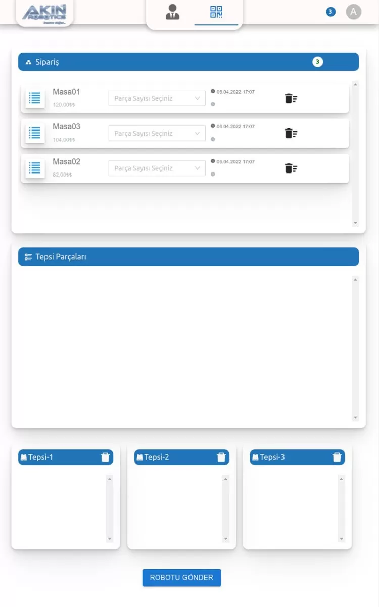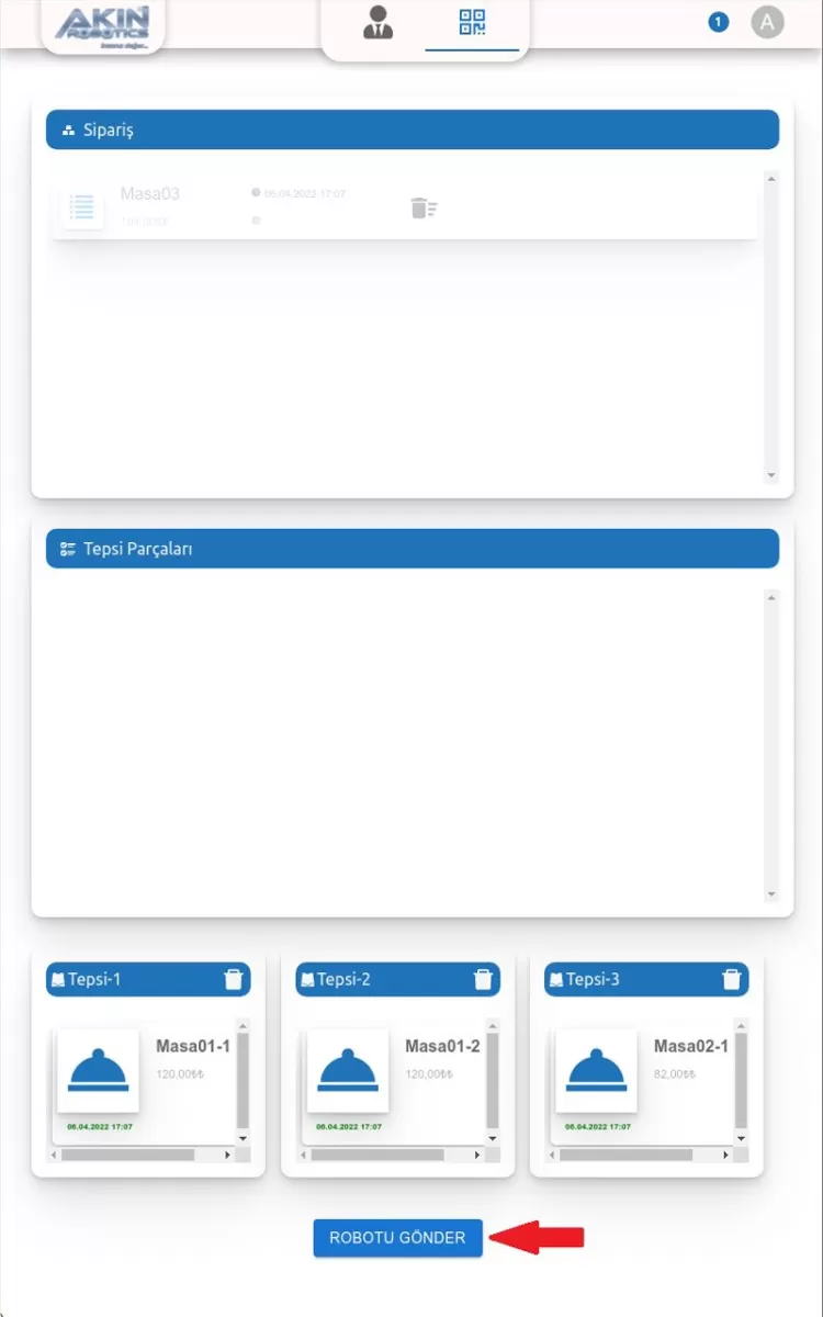 Information: When the relevant orders are placed on the trays, your robot will automatically take the orders to the tables you specify.