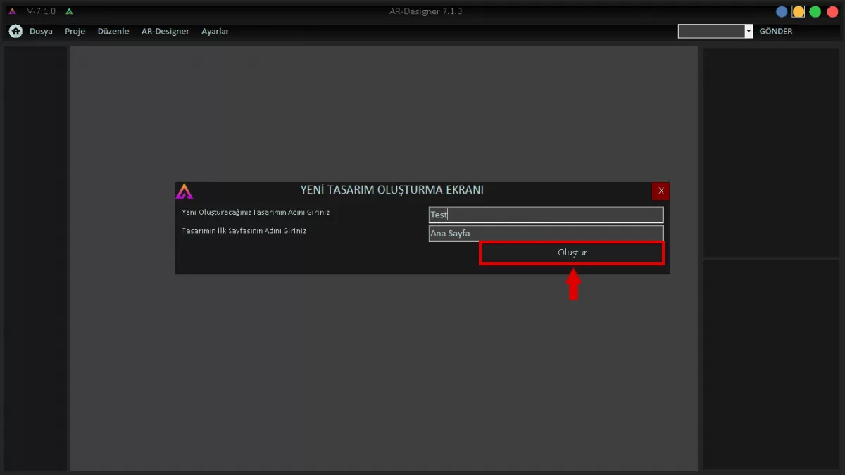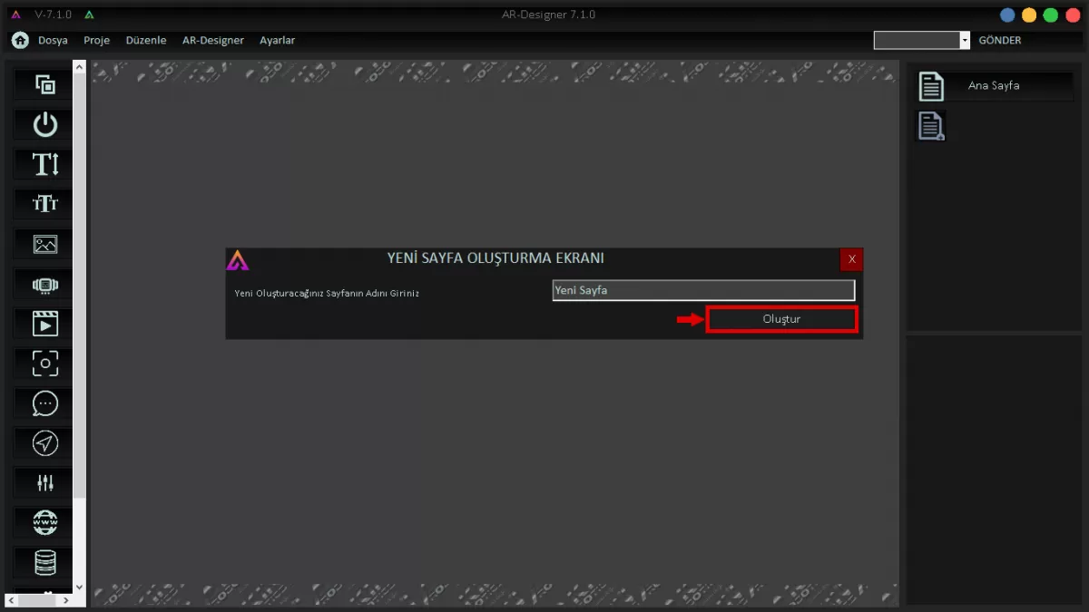 Açılan ekrandan Yeni Tasarım Adını oluşturunuz, ardından ilk sayfanızın ismini belirleyerek “OLUŞTUR” butonuna tıklayınız.