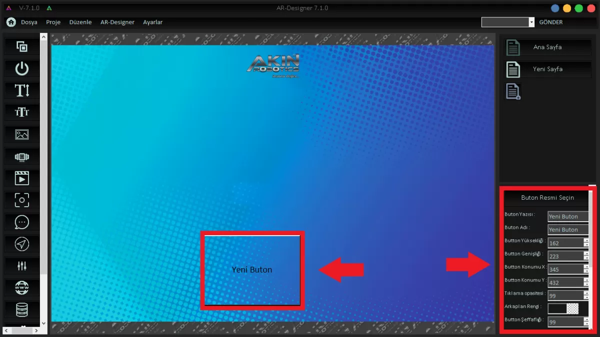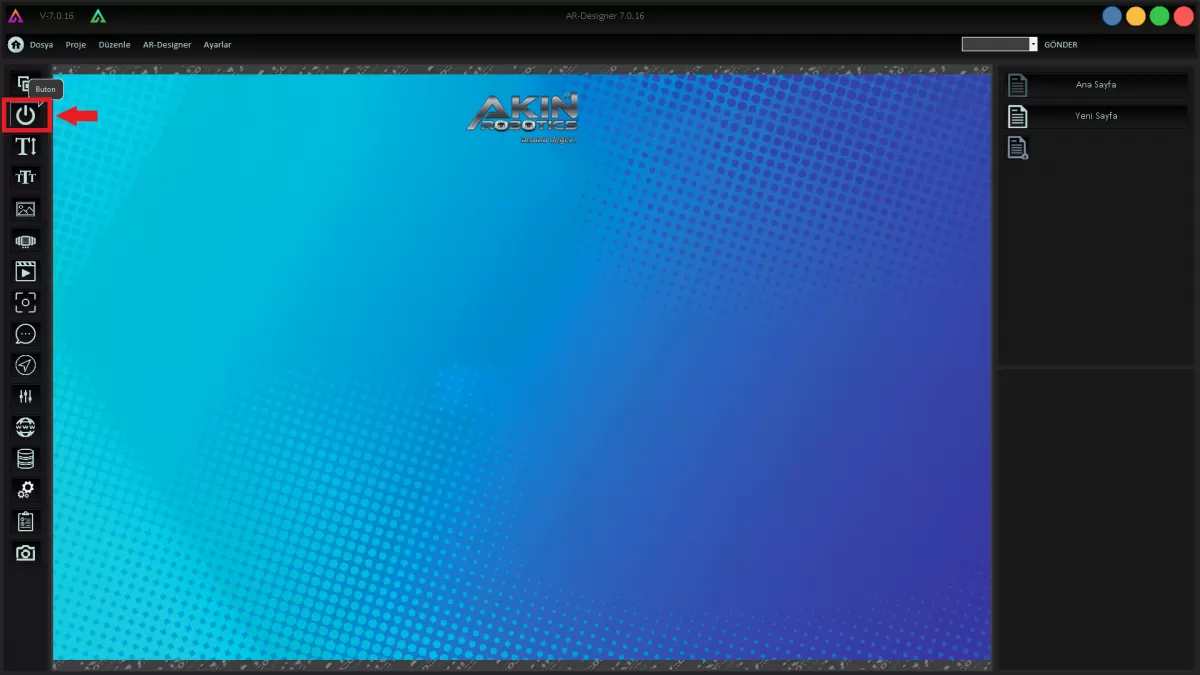 Tasarımınız üzerinde aktif olarak kullanacağınız buton atamalarını yapmak için ‘Buton’ iconuna tıklayınız. Ardından uygulama ekranına sürükle bırak yöntemi ile butonunuzu istediğiniz yere, istediğiniz büyüklükte konumlandırınız.