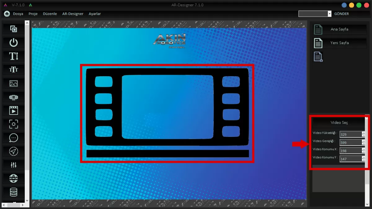 Tasarımınıza video eklemek için Şekil 12’de gösterildiği gibi “Video” butonuna tıklayınız. Sürükle-bırak yöntemi ile istediğiniz boyutta tasarımınıza ekleyiniz. Sağ alt pencereden videonuzun özelliklerini düzenleyiniz.(25-1)