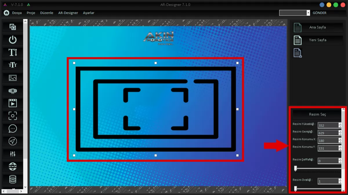 Tasarımınızın sayfasına birden fazla resim ekleyebilmek için “Kayan Resim” butonuna tıklayınız. Sürükle-Bırak yöntemi ile istediğiniz boyutta konumlandırabilirsiniz. Sağ Alt penceredeki özellikleri tasarımınıza uygun şekilde değiştirebilirsiniz.
