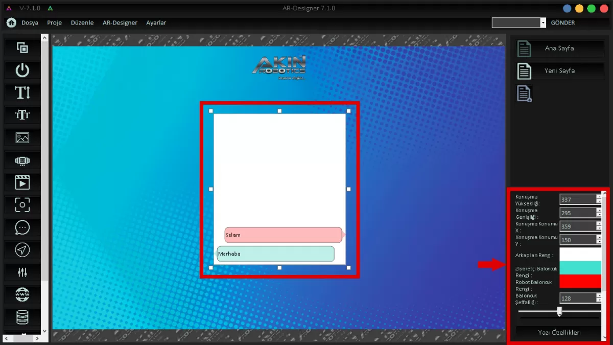 Konuşma Penceresi özelliklerini görüntülemek ve düzenlemek için tasarımınıza eklediğiniz Konuşma Penceresi’ne sağ tıklayınız. Ekranın sağ alt kısmında açılan özellikler sekmesinden Konuşma Penceresi’ni düzenleyebilirsiniz.