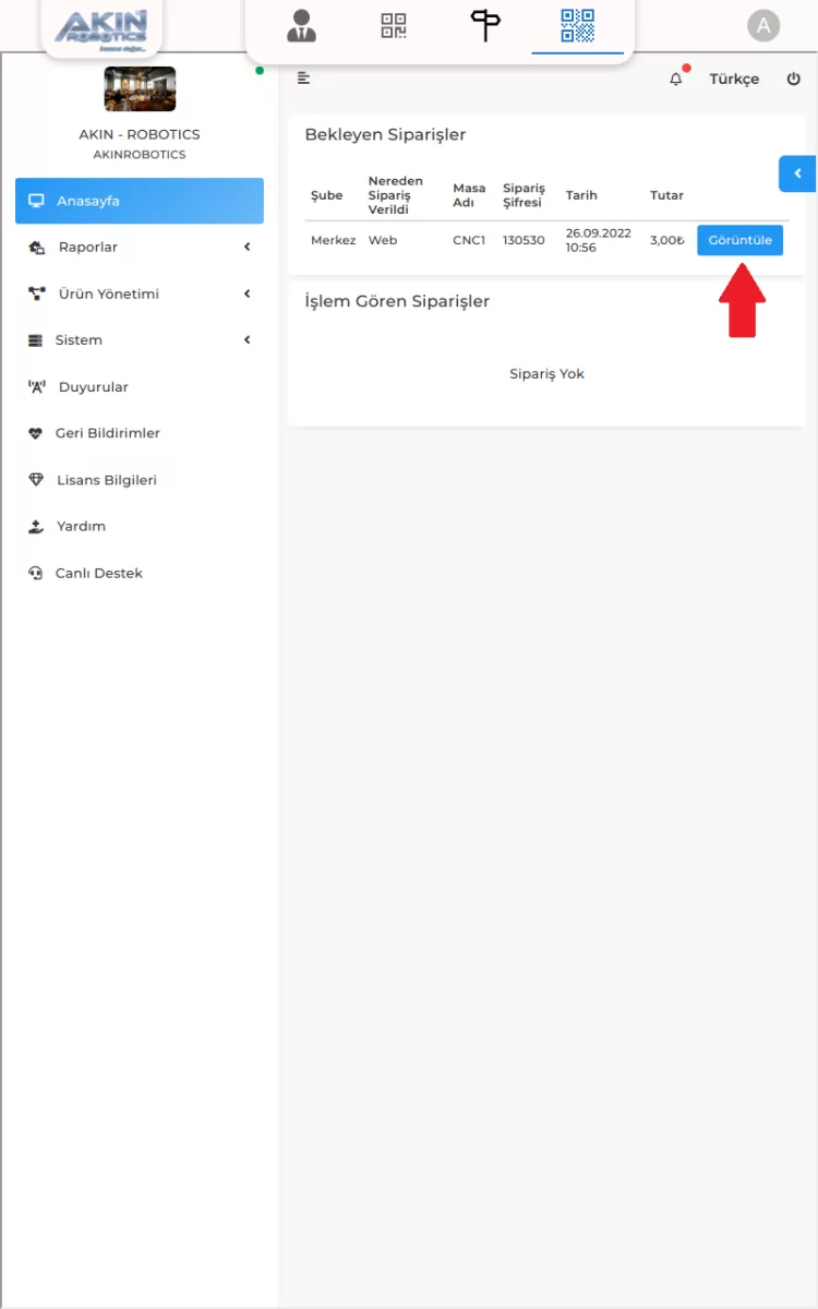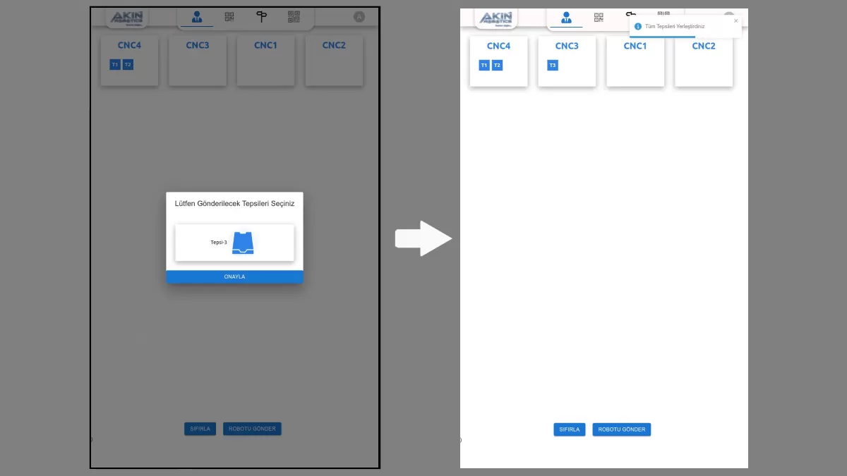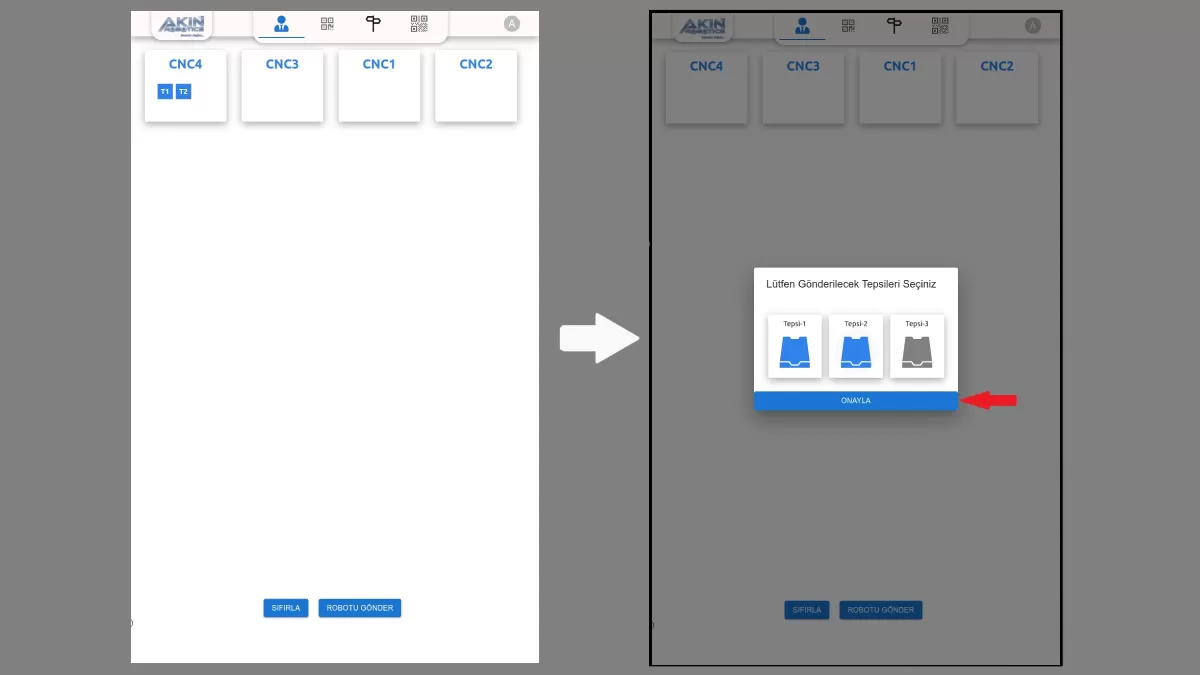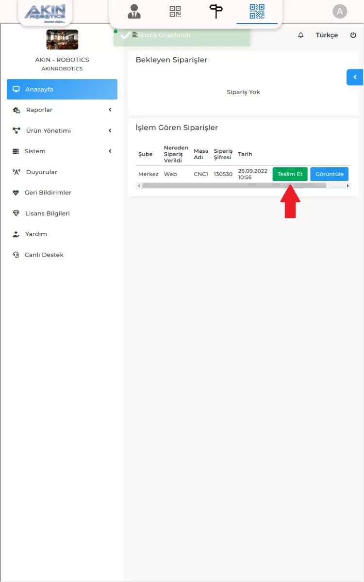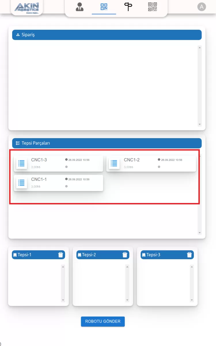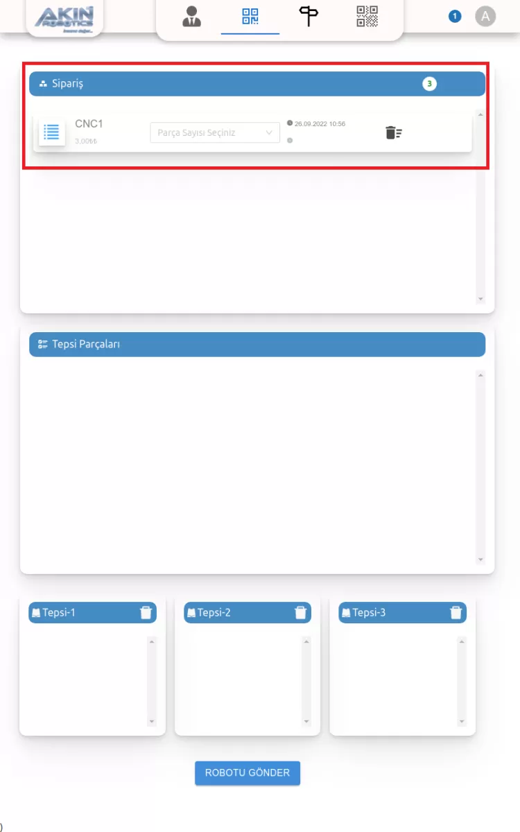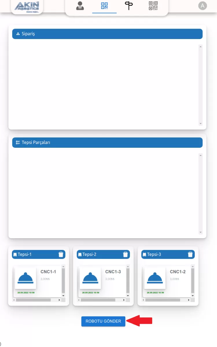 Sipariş işlemleri tamamlandıktan sonra 'Robotu Gönder' butonuna basınız.