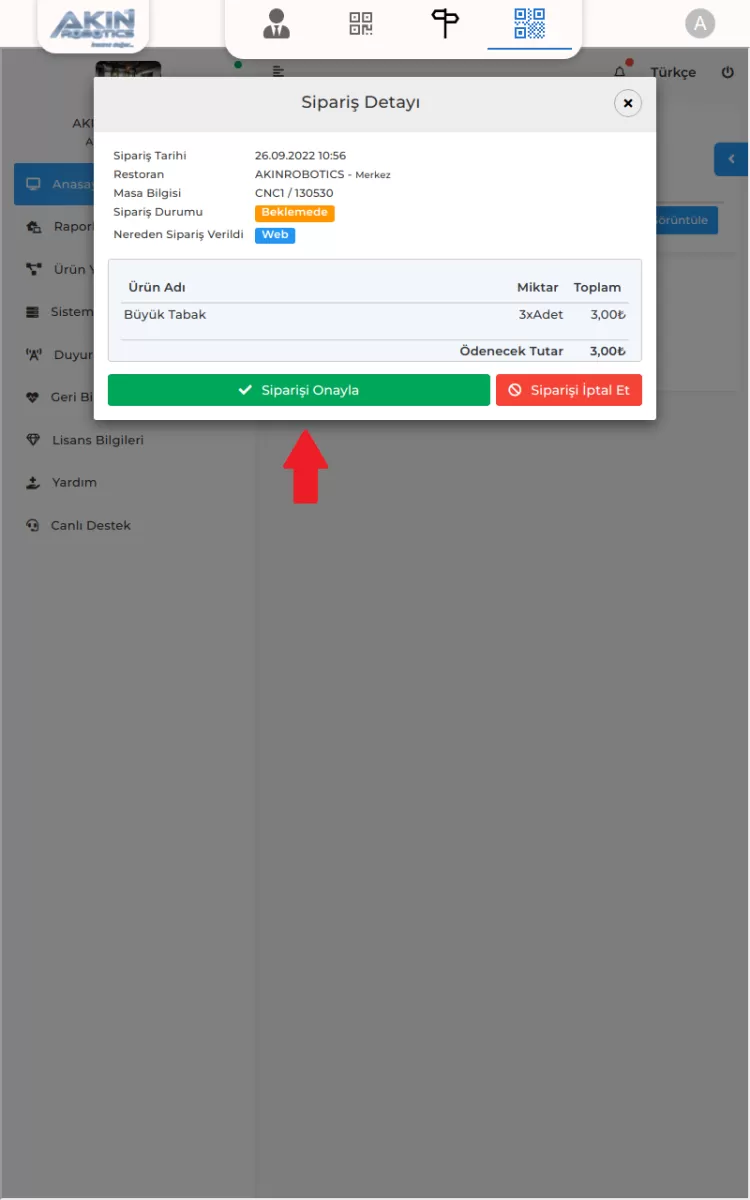İşlemler tamamlandığında siparişlerin götürüleceği masada tepsilerin ismi görülecektir.