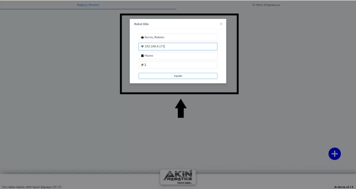 Sağ üst köşedeki A harfine basıyoruz, ardından açılan menüde robotun ip adresi ve ayarlar menüsüne geçiş butonu görülecektir.Açılan pencereden ayarlar butonuna tıklıyoruz.